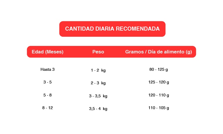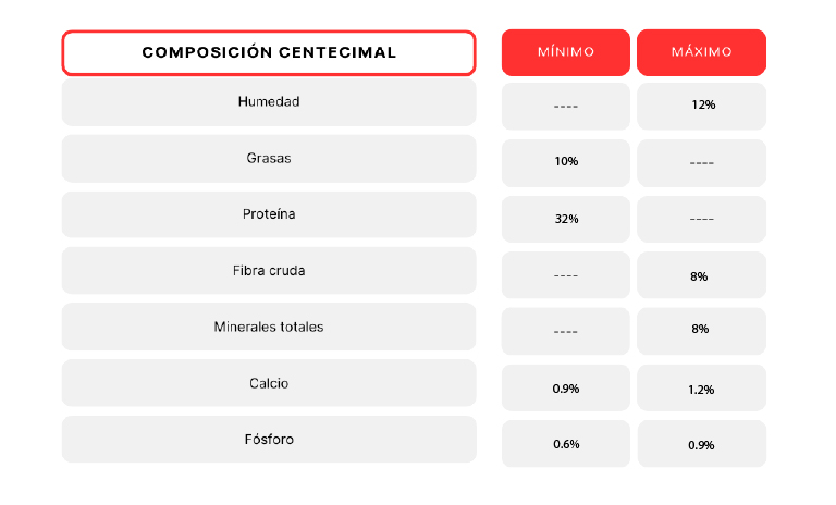 Harina de pollo, trigo, arroz, germen de maíz, gluten de maíz, aceite de pollo, harina de carne y hueso, hidrolizado proteico de pollo, aceite de pescado, sal, fosfato de calcio, zeolita, carbonato de calcio, dióxido de titanio, metionina, colorante caramelo, dipropionato de amonio, ácido propiónico, BHT, BHA, núcleo vitamínico mineral: vitaminas A, D3, E, K, B1, B2, B6, B12, ácido fólico, ácido nicotínico, ácido pantoténico, biotina, colina. Minerales: zinc, hierro, cobre, yodo, manganeso y selenio.